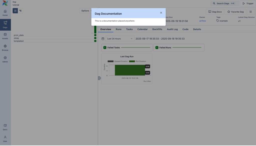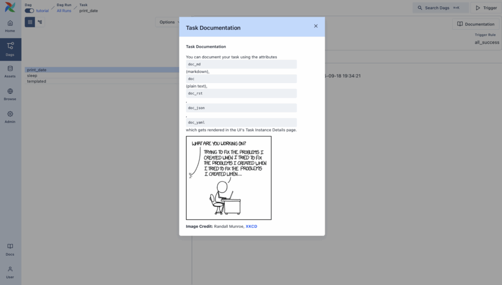 Bạn có thể thêm tài liệu cho DAG hoặc các tác vụ riêng lẻ của mình. Trong khi tài liệu DAG hiện hỗ trợ markdown, tài liệu tác vụ có thể ở dạng văn bản thuần túy, markdown reStructuredText, JSON hoặc YAML. Việc đưa tài liệu vào đầu file DAG là một thực hành tốt.